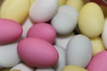 Oud hollands snoep is terug! de amandel bonen van vroeger. een gekleurd hard snoepje met in het midden een amandel.